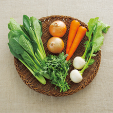 タマネギは皮をむきひと口大に切る。ニンジンは皮ごとひと口大に切る。 カブはへたを取り除き、ひと口大に切る。葉はひと口大に切る。 コマツナとシュンギクはひと口大に切る。 |